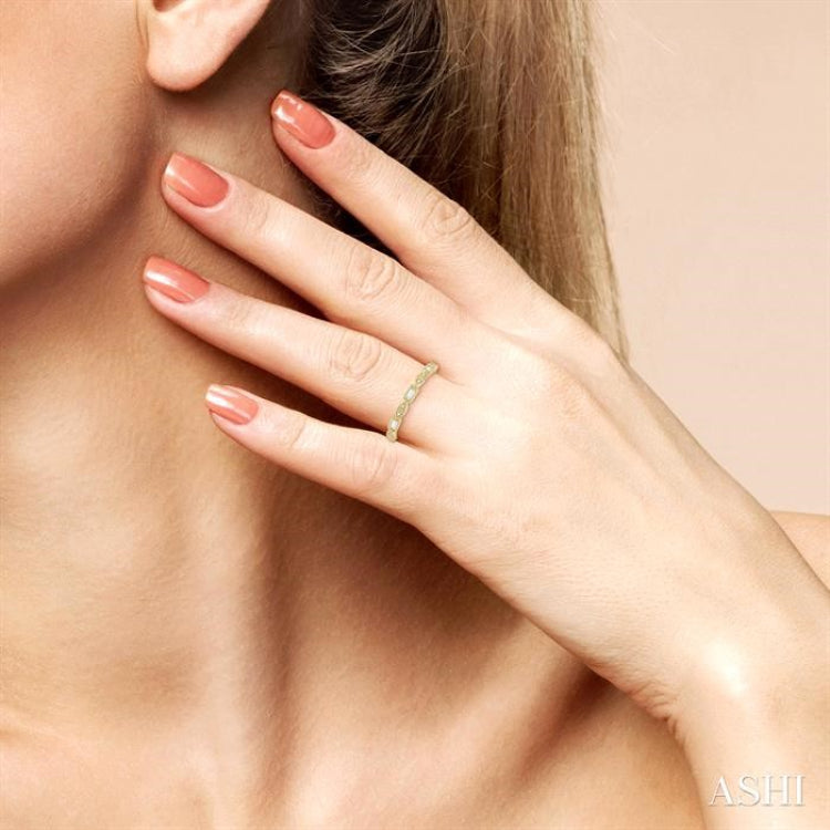 A delicate design and attractive craftsmanship highlight the beauty of this chic diamond stackable band. It can be worn with other stack bands or by itself as you choose to wear it. The ring comprises of 4 tiny marquise and 3 rectangle shaped mounts that connect with each other to form the ring top. While each of the rectangular mounts is embellished with a baguette diamond, the marquise shaped motifs feature 2 pave set round cut diamonds each. A milgrain finish adds to the dainty look. The stackable band is designed in 14 karat yellow gold. The total diamond weight is 1/10 Ctw.