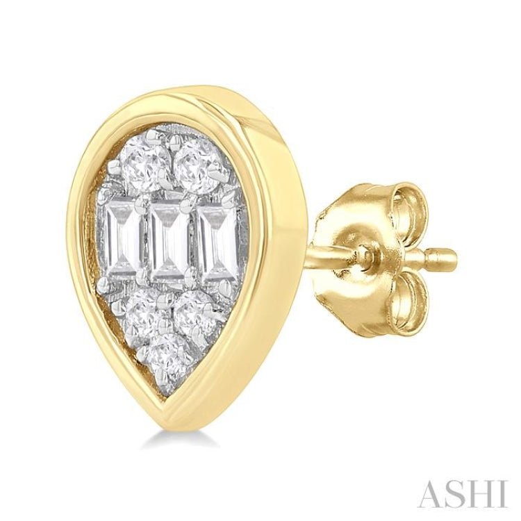 1/5 Ctw Petite Bezel Set Pear Shape Fusion Baguette and Round Cut Diamond Fashion Stud Earring in 10K Yellow Gold